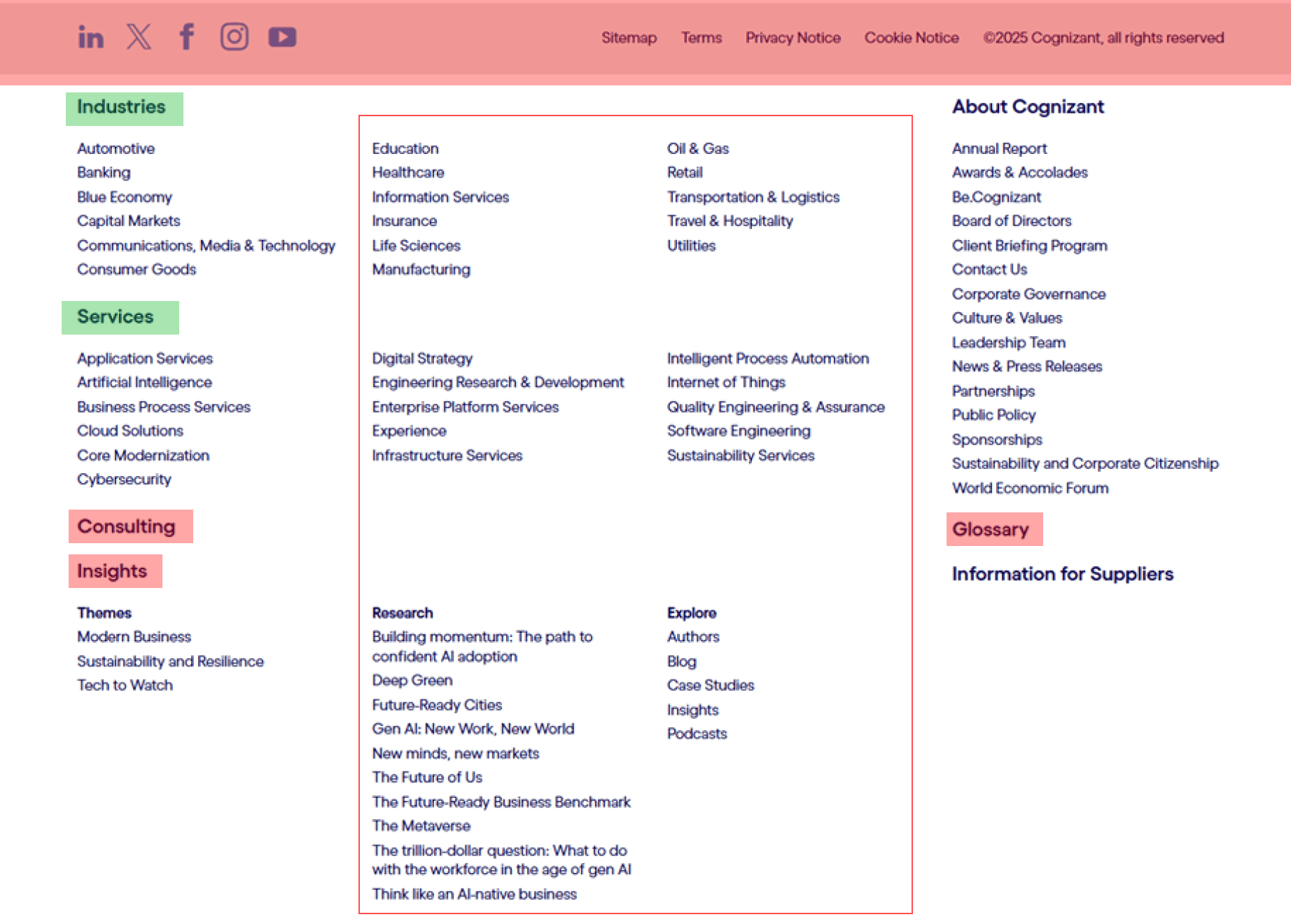 I then read articles and best practice guides on footer patterns from design firms such as Nielsen Norman Group and Forge & Smith to understand what users typically expect at the bottom of a complex site. This gave me a baseline for what “good” looks like before changing anything on Cognizant’s side.
