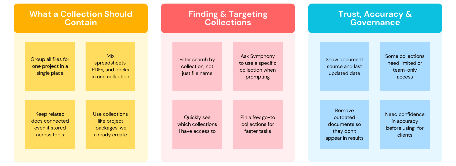 I used affinity mapping to cluster the interview notes into three themes: how users define and structure a “collection,” how they want to retrieve and target those collections inside Symphony, and what they need to trust the accuracy, governance, and visibility of the information they rely on.