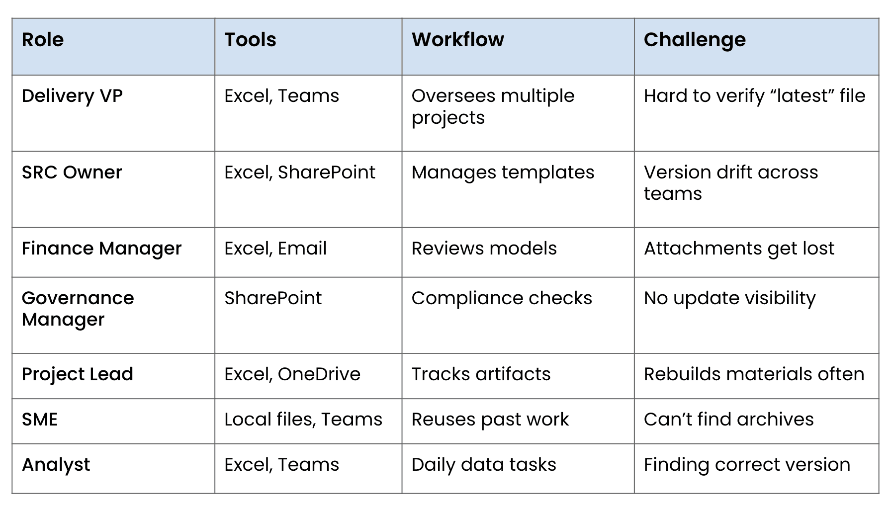 We interviewed seven internal users across roles in delivery, finance, governance, and analysis. Each person walked us through how they store, track, and retrieve information as part of their daily work. To compare workflows, I summarized the interviews in a role-by-role grid that captures the tools they rely on, how they complete their tasks, and the challenges that consistently slow them down.