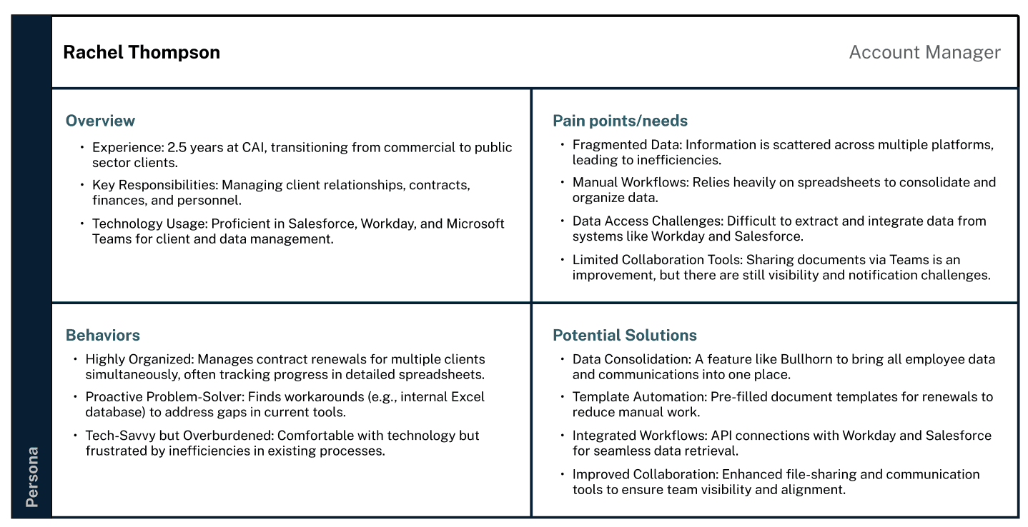 Our research focused on account managers, governance reviewers, and team leads inside CAI. These roles work with large datasets and need reliable ways to find, share, and reuse information. Their tasks often depend on fast turnaround times and consistent documentation.