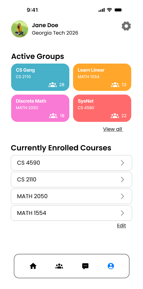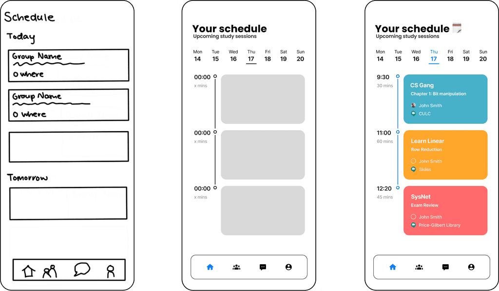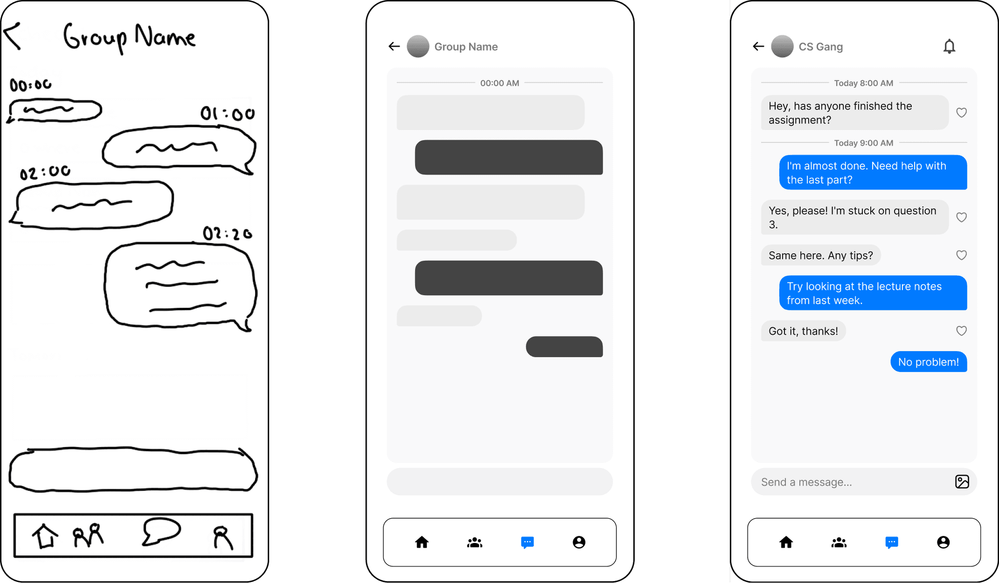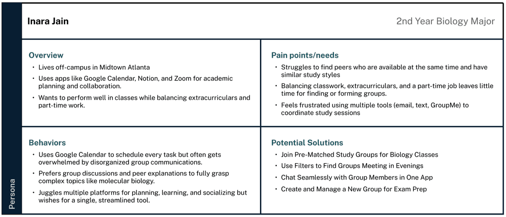 User stories allowed us to focus on specific, relatable scenarios that students encounter, such as finding a group with a matching schedule or setting up a new group for last-minute exam prep. These stories served as a bridge between abstract design goals and tangible app features, ensuring that every functionality—like customizable filters and group recommendations—directly addressed the challenges students face in their daily academic lives.